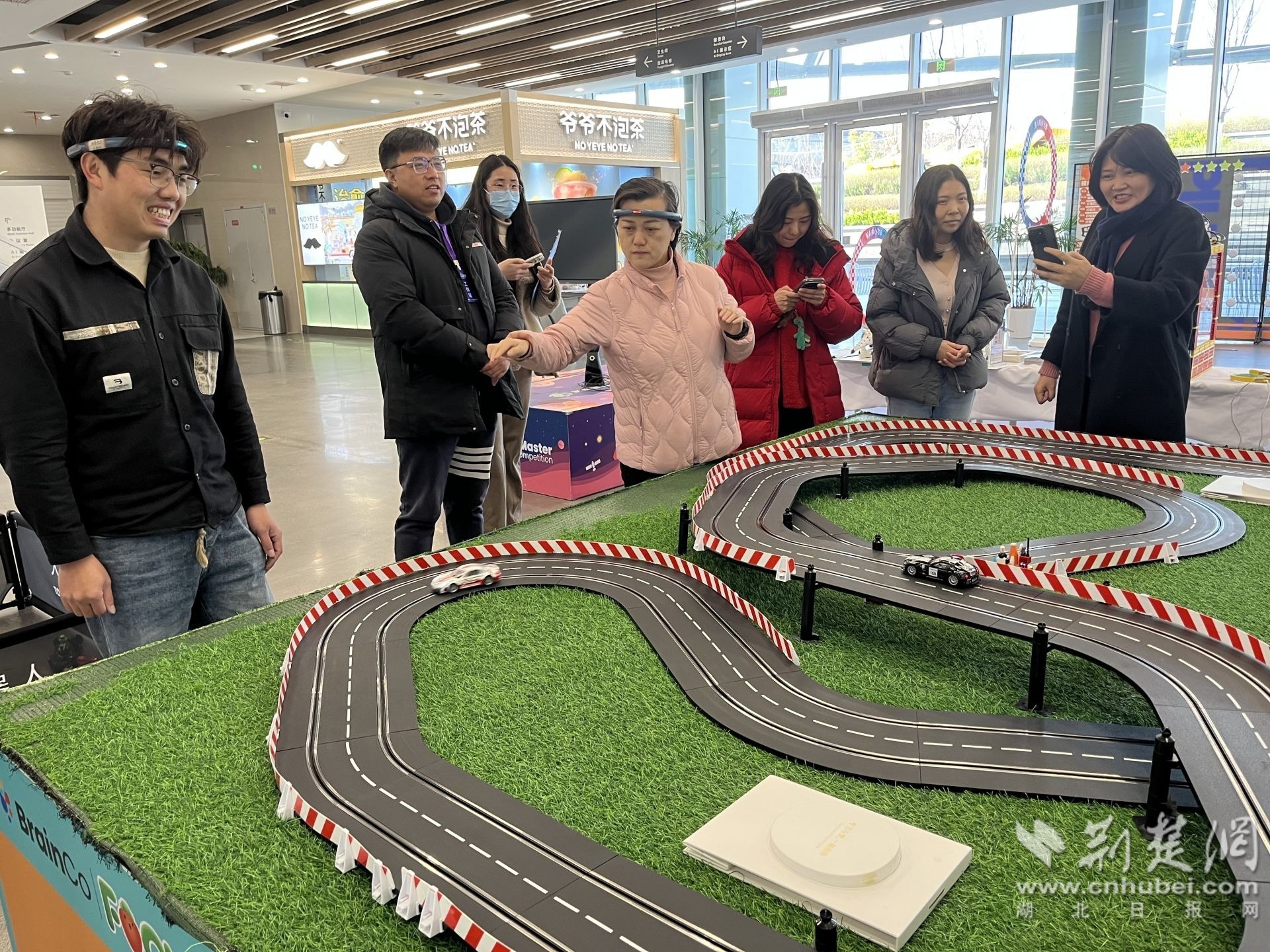 在工作人員的引導(dǎo)下,大家依次體驗(yàn)了多項(xiàng)科技互動項(xiàng)目。在智控機(jī)器狗展示區(qū),黨員們親手操作機(jī)器狗,近距離感受其靈活動作與智能響應(yīng)能力;腦控賽車體驗(yàn)區(qū),大家?guī)夏X機(jī)智能頭環(huán),集中精神推動小車前進(jìn),感受“意念控制”的科技魅力;VR重走長征路體驗(yàn)中,黨員們佩戴設(shè)備后“置身”長征途中,沉浸式體驗(yàn)革命先輩的奮斗歷程。