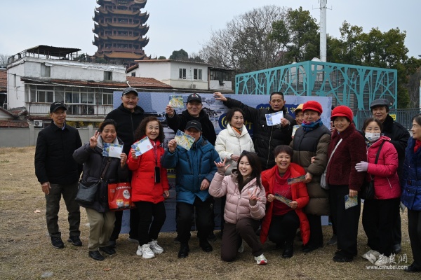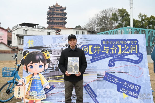 快閃活動選址社區(qū)黃鶴游園,抬頭即見巍巍黃鶴樓?,F(xiàn)場,82歲守井人謝邦純老人與社區(qū)工作人員、青年學子一同講述“三井一臺”的故事,帶領(lǐng)在場居民穿越時空,觸摸楚王府遺韻與市井生活記憶。