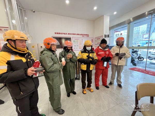 武昌區(qū)總工會維權(quán)服務(wù)部負(fù)責(zé)人夏巨波與街道工會工作人員一邊分發(fā)慰問物資,一邊與大家親切交談:“雪天路滑,騎車千萬要慢行,安全第一。”“驛站里備了熱水和微波爐,累了隨時進(jìn)來歇腳,別凍著自己?!?/p>