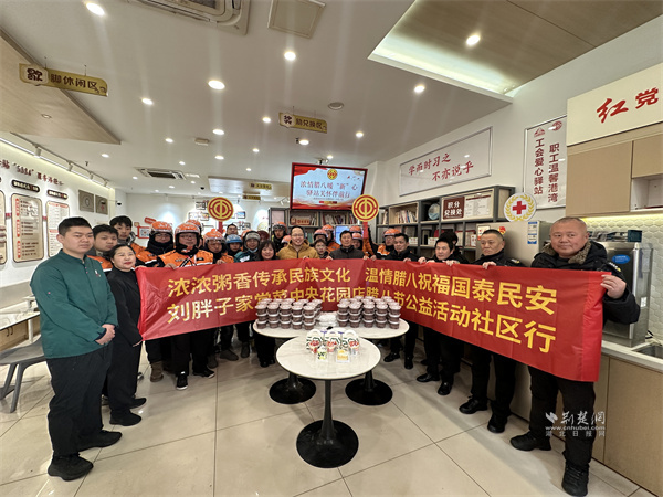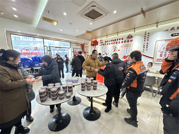 活動現(xiàn)場,“暖心聯(lián)盟”企業(yè)劉胖子家常菜館中央花園店開展“暖心臘八粥 暖胃更暖心”服務(wù),提供百余份臘八粥。工作人員將臘八粥分裝至便攜餐盒,搭配一次性餐具,供戶外工作者排隊領(lǐng)取,方便其攜帶食用。外賣小哥夏博文表示,驛站每逢節(jié)日都會組織關(guān)懷活動,剛開完晨會就能吃上熱粥,切實感受到“娘家人”的關(guān)懷,渾身充滿干勁。