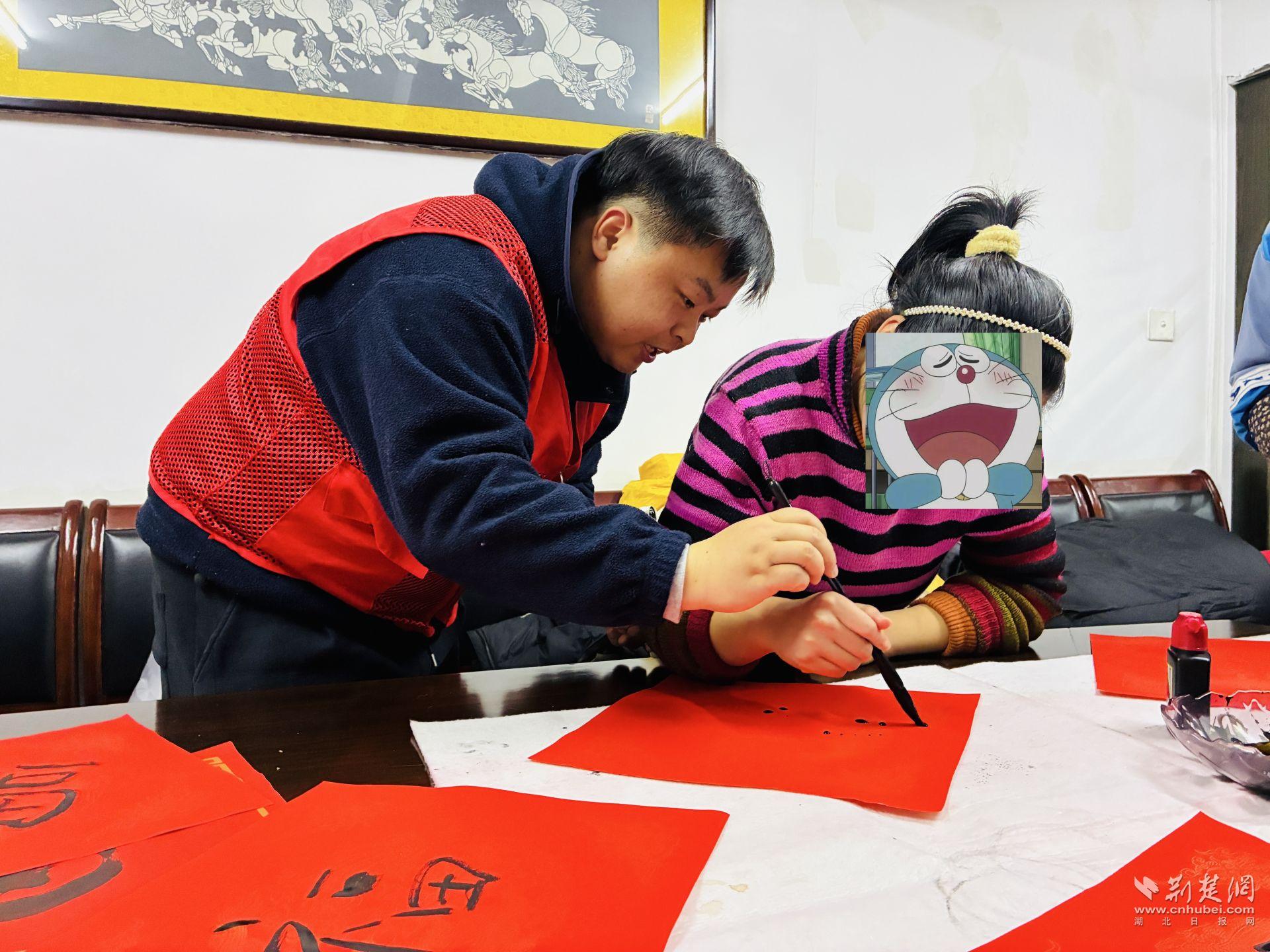 活動(dòng)現(xiàn)場(chǎng)還設(shè)置了春聯(lián)書寫互動(dòng)區(qū)。書法老師從握筆姿勢(shì)、用筆力度講起,耐心示范基礎(chǔ)筆法,并根據(jù)每個(gè)人的情況進(jìn)行指導(dǎo)。筆墨鋪展間,一副副春聯(lián)逐漸成形,內(nèi)容樸實(shí)真切,寄托著對(duì)新一年的期望。