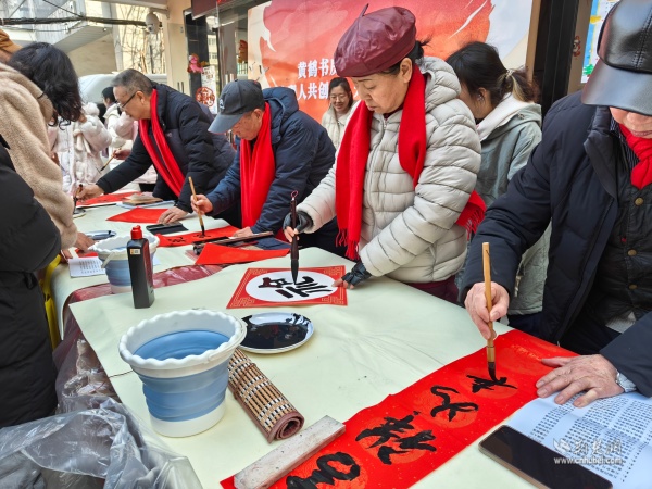 靜態(tài)的閱讀空間里藏著動態(tài)的文化活力。每周固定開展的書法研習、讀書分享活動中,總能看到老少讀者沉浸其中的身影。青少年圍坐桌前臨摹字帖,老年讀者在窗邊沉浸品讀,年輕父母攜娃共讀繪本,不同年齡層在墨香與書聲中和諧交流。春節(jié)期間,書房特邀首義書畫協(xié)會的老師現(xiàn)場揮毫,紅紙鋪展間,一副副滿載祝福的春聯(lián)、一張張寓意吉祥的福字被送到居民手中,讓文化關(guān)懷伴隨墨香走進千家萬戶。“手寫的春聯(lián)更有溫度,墨香里都是社區(qū)的關(guān)懷?!本用窭畎⒁探舆^春聯(lián)時笑著說,她的話也道出了居民共同的心聲。