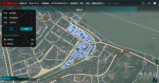 荊楚網(wǎng)(湖北日報(bào)網(wǎng))訊(通訊員 王新剛)7月18日,在黃石市房屋安全監(jiān)管平臺(tái)點(diǎn)擊選擇黃石港區(qū)勝陽港街道天橋社區(qū)后,一鍵查詢,顯示該區(qū)域有C級(jí)危房5棟,D級(jí)危房為0。