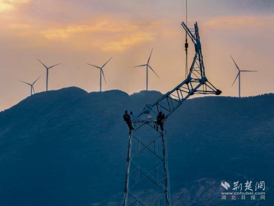 當(dāng)天下午6點(diǎn),夕陽(yáng)染紅了天際。在斜輝映照下,4名電力工人挺立在鐵塔上,準(zhǔn)備最后的螺栓緊固工作。