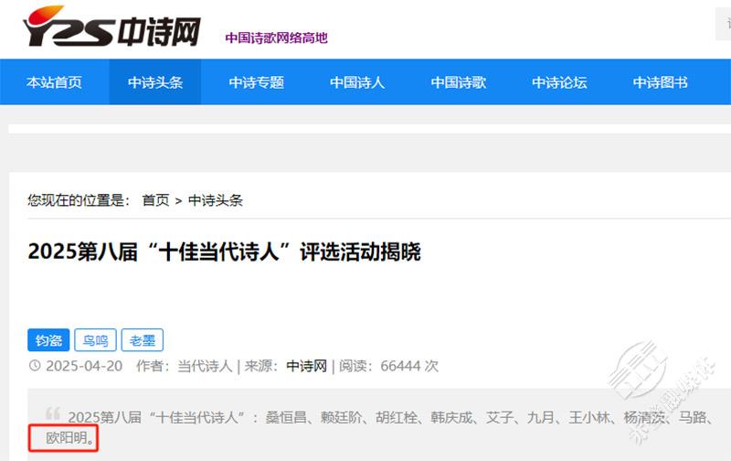 4月20日,2025第八屆“十佳當(dāng)代詩人”評選活動(dòng)揭曉評選結(jié)果塵埃落定,赤壁詩人歐陽明光榮上榜,這是赤壁詩人首次在該榜亮相。