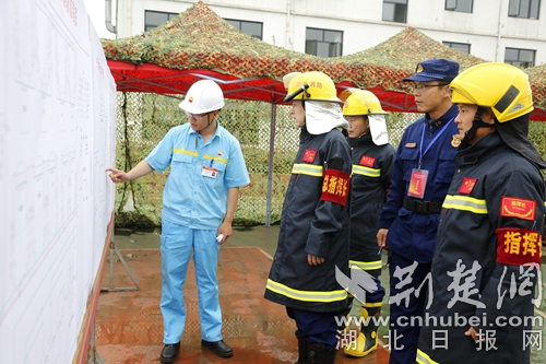 圖為石油化工單位負(fù)責(zé)人講解演練場所現(xiàn)場。通訊員朱燕林?jǐn)z