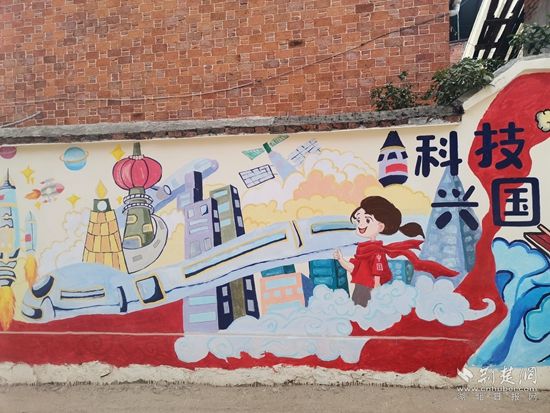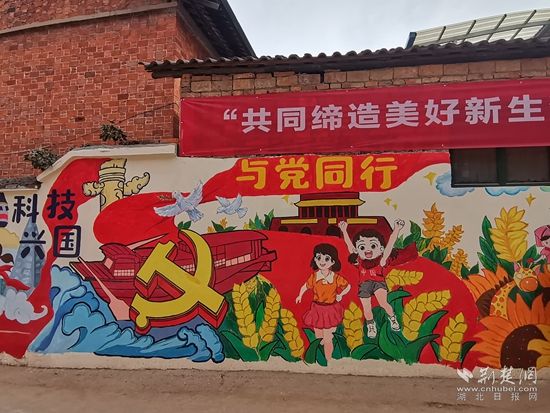 這面墻體上繪制了沐浴黨恩、運(yùn)動(dòng)強(qiáng)國(guó)、生態(tài)文明、科技興國(guó)、與黨同行、向黨向未來(lái)六大主題,其中既有充滿活力、朝氣和正能量的向日葵、麥穗、綠樹(shù)等植物,又有熊貓、猴子、兔子、獅子等可愛(ài)的動(dòng)物。