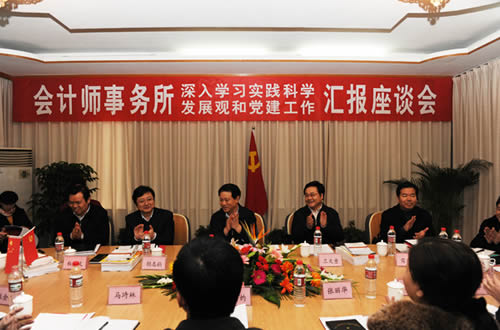 在座談會上,潘立剛同志分別聽取了王文童同志關(guān)于全省會計師事務(wù)所開展深入學(xué)習(xí)實(shí)踐科學(xué)發(fā)展觀活動和注冊會計師行業(yè)黨建工作情況的匯報,武漢市財政局總會計師、市財政局會計師事務(wù)所深入學(xué)習(xí)實(shí)踐科學(xué)發(fā)展觀活動指導(dǎo)小組副組長張灼、襄樊市財政局副局長、市財政局會計師事務(wù)所深入學(xué)習(xí)實(shí)踐科學(xué)發(fā)展觀活動指導(dǎo)小組副組長馬琦林、咸寧市財政局黨組成員、市會計師事務(wù)所深入學(xué)習(xí)實(shí)踐科學(xué)發(fā)展觀活動指導(dǎo)小組副組長張麗華以及中勤萬信會計師事務(wù)所黨支部書記、董事長張金才,武漢眾環(huán)會計師事務(wù)所董事長、武漢市注冊會計師行業(yè)黨委副書記黃光松,咸寧永興會計師事務(wù)所所長、咸安區(qū)政協(xié)委員張麗平等同志先后匯報發(fā)言。大信會計師事務(wù)所湖北分所、中瑞岳華會計師事務(wù)所湖北分所、武漢興業(yè)會計師事務(wù)所、襄樊華炬會計師事務(wù)所黨支部書記也參加了此次座談。
