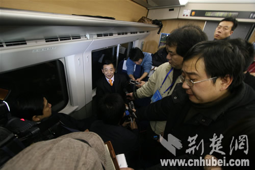 列車上,武漢鐵路局黨委書記張友松接受了記者采訪。他說,武廣高鐵充分展示了中國(guó)高速鐵路技術(shù)的最新成就,振奮了民族自信心。它的建成開通,充分證明了中國(guó)鐵路建設(shè),尤其是高速鐵路建設(shè)發(fā)展水平已處于世界領(lǐng)先水平。