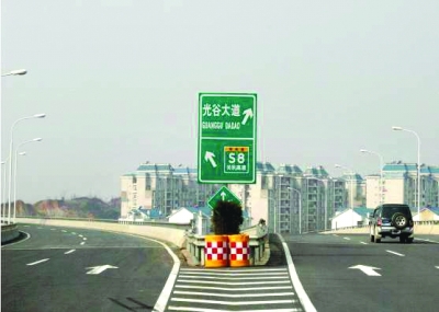 三環(huán)線由天興洲大橋往東新開(kāi)發(fā)區(qū)光谷大道的一塊指路牌,左行指的是“關(guān)豹高速”,右行指的是“光谷大道”;但該路口左行是經(jīng)武黃高速去鄂州方向的,右行是經(jīng)三環(huán)線去白沙洲大橋方向的。路牌因信息不全、牌面又小,不少駕車人員到該路口時(shí)停車查看,不知行進(jìn)方向。
